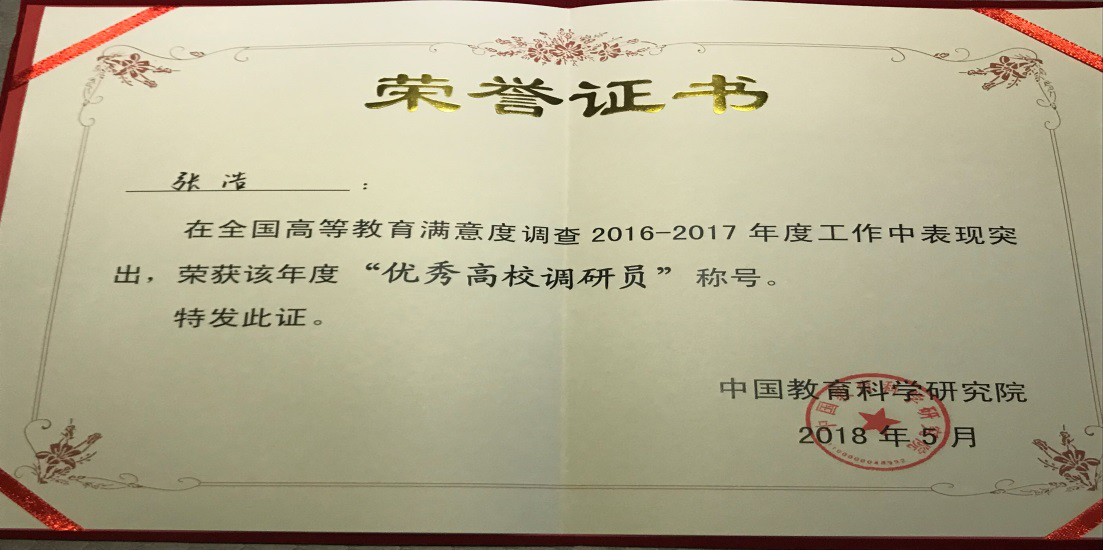 本次调查主要采用问卷调查法,通过网络或手机填报的方式完成问卷数据的填写与收集。在本次启动会上,公司张浩老师获得了由中国教育科学研究院颁发的2016–2017年度“优秀高校调研员”荣誉称号。